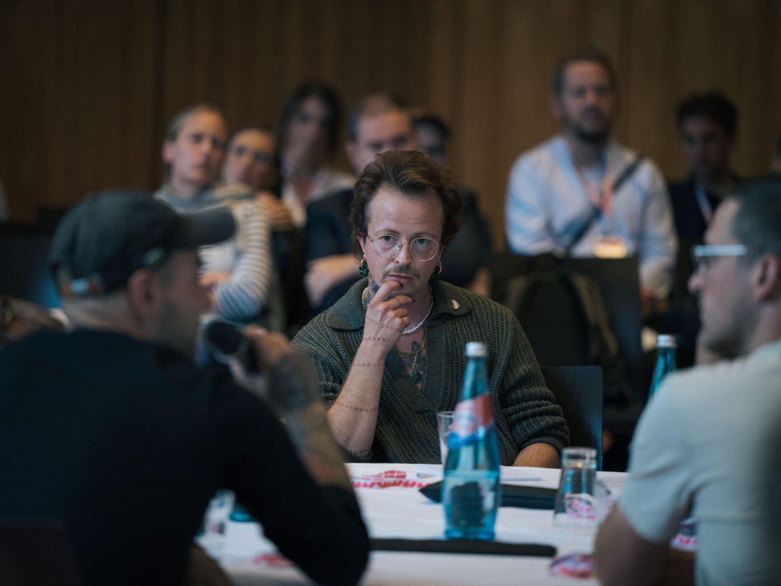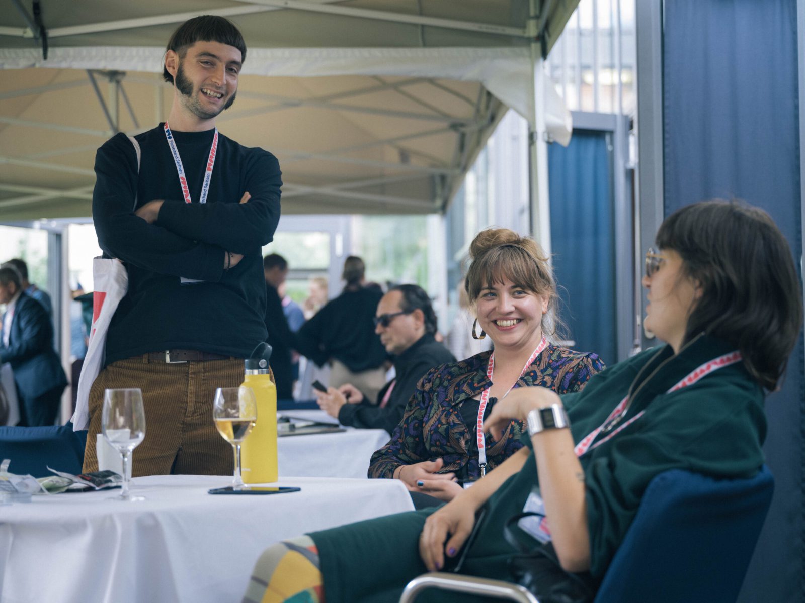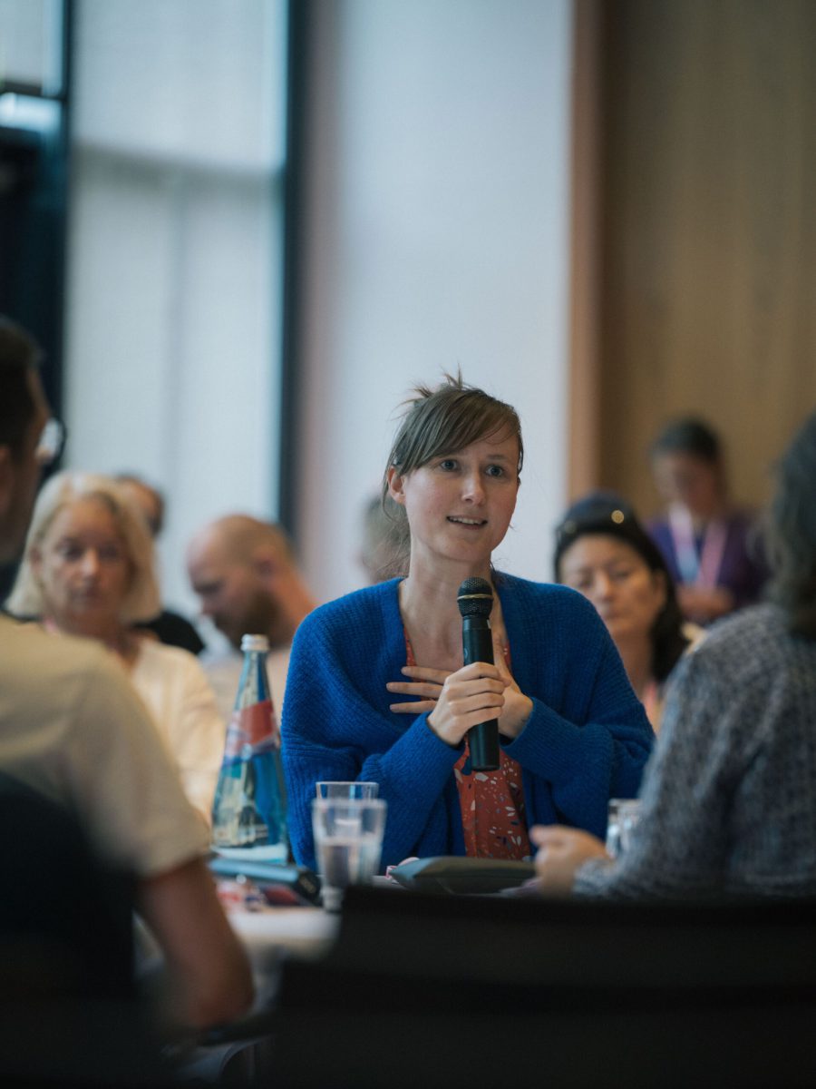 Einen Einblick in viele verschiedene Gewerke und deren aktuelle Situation bot der Praxisaustausch unter der Fragestellung: Wie sieht es denn gerade für aktuelle Filmprojekte aus? Dabei kamen höchst unterschiedliche Realitäten zum Vorschein. Auch wenn Filmproduzent Holm Taddiken von neuen Herausforderungen durch die steigenden Kosten konfrontiert ist, so arbeitet es sich seiner Meinung nach »vorzüglich«. Drehbuchautorin und Regisseurin Alice von Gwinner erlebt mit dem Projekt Mitmalfilm gerade eine Welle des Aufschwungs – unter Applaus erzählte sie von ausverkauften Lagern und aufgegangenen Plänen. Tonmeister André Klar hingegen »treffen gerade alle Krisen«. Seine Mindestgagen sind öffentlichrechtlichen Auftraggebenden zu teuer – unter anderem weil es in Sachsen zu einfach ist, Tonmenschen eine Produktion für 170 Euro machen zu lassen. Leon Brandt verglich die Situation nach seinem ersten Fernsehprojekt als Kameramann mit einem »freien Fall« und erzählte von den Schwierigkeiten sich in dieser Flaute über Wasser zu halten. Auch Drehbuchautor:in Lion H. Lau hat die Flaute erreicht: »Ich bin großflächig arbeitslos«. Da Lion in den derzeitigen großen Produktions-firmen der Region keine Zukunft für Geschichten aus queerer Perspektive sieht, arbeitet Lion kaum im Raum Mitteldeutschland.