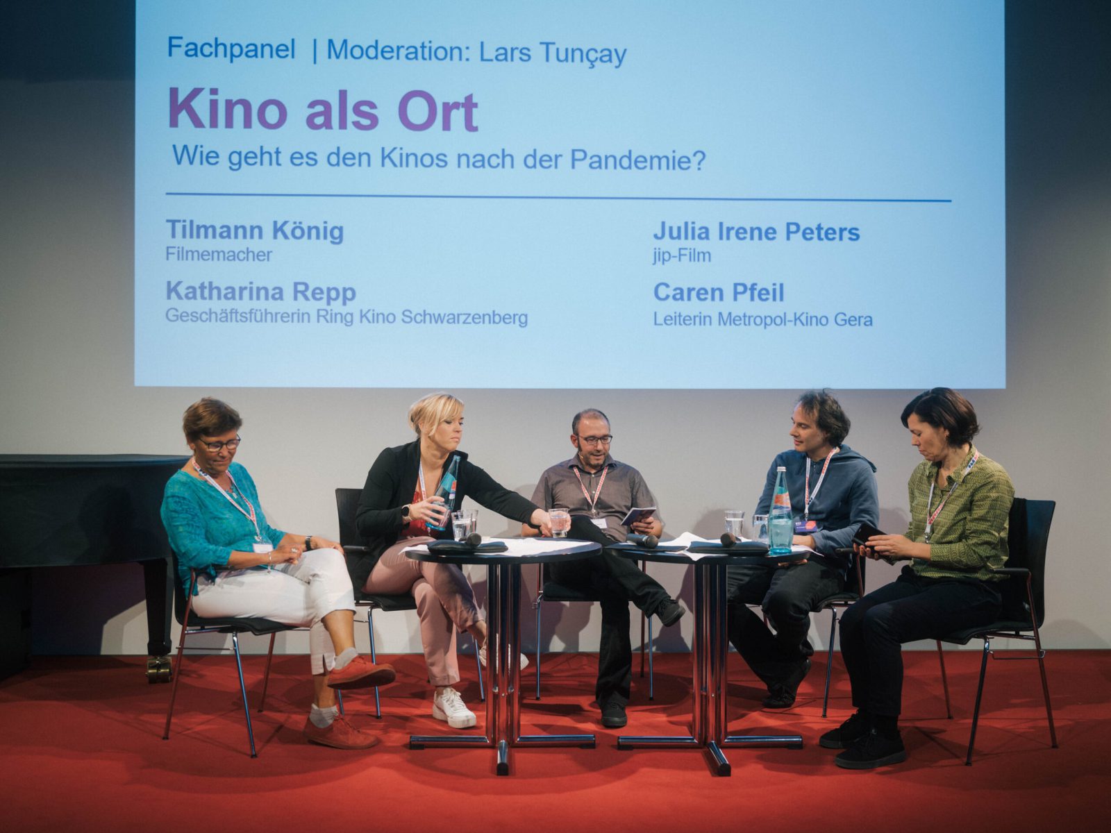 Das Panel »Kino als Ort« bot die Möglichkeit sich über das Befinden der Kinos nach der Pandemie auszutauschen. »Wir leben noch«, so Katharina Repp, Kinobetreiberin aus dem Erzgebirge. Über das Verlernen und Wiederanerziehen von Kino und den Vorteilen, welche der Kinosessel gegenüber dem heimischen Sofa bietet, diskutierten zudem Filmemacher Tillmann König, Kinobetreiberin Caren Pfeil und Verleiherin, Produzentin und Regisseurin Julia Irene Peters.
